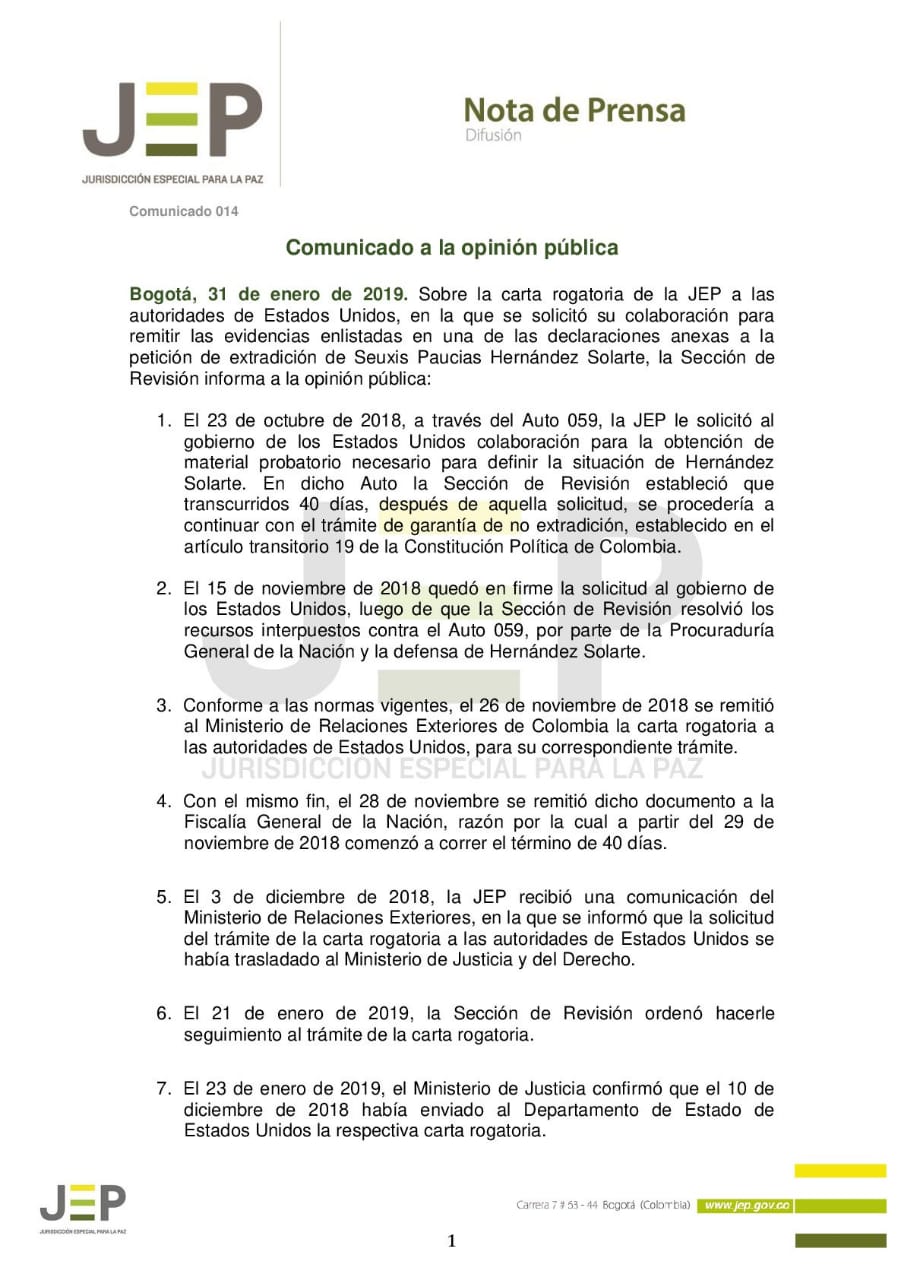 Conozca acá el comunicado expedido por la Jurisdicción Especial para la Paz respecto de lo sucedido con la Carta Rogatoria dirigida al gobierno de Estados Unidos para solicitar las pruebas pertinentes en el caso del ex combatiente Seuxis Paucias Hernández Solarte.